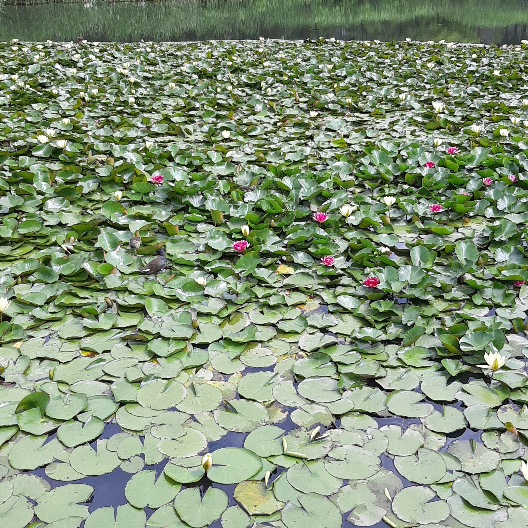 蓮の花がきれいな池には、バン、というらしい黒い鳥の親子がいた。蓮の葉の上を器用に歩いて水面へ入水、ちいさいのの鳴き声がかわいくて、静かで、おだやかで、なんかとてもよかった。