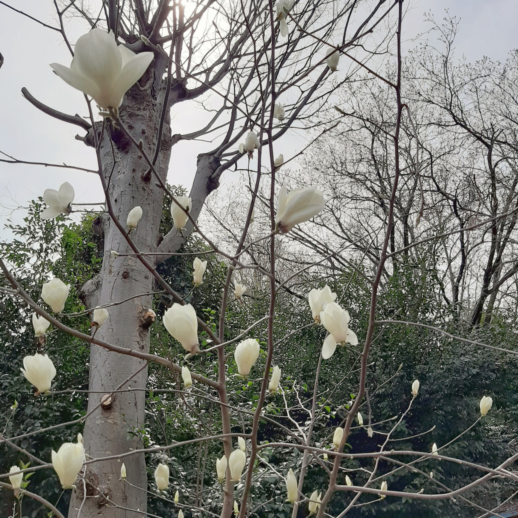 神社に行ったら、思いがけずハクモクレンが咲いていた。